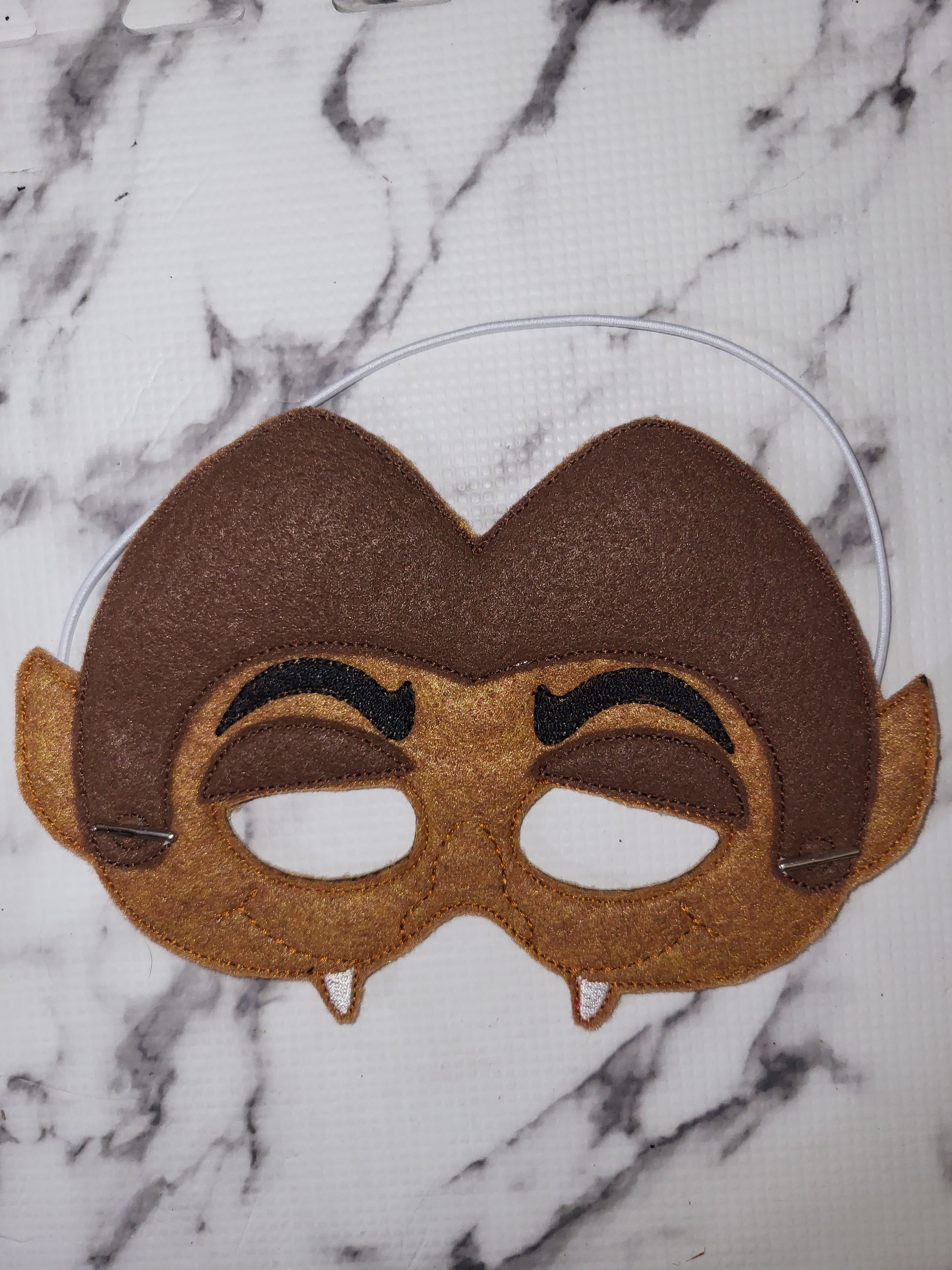 This mask is made of a synthetic felt and bamboo mixture for comfort. it is machine embroidered and hand cut. It is machine washable and color safe. There is a barbed elastic string measuring 13" on the backside of the mask to keep it securely on the face. The mask design comes in 2 sizes- medium size measures approximately 5"x7", and large measures 6"x10".